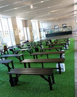 緑の芝生が敷かれ,木の椅子も並んでいる。